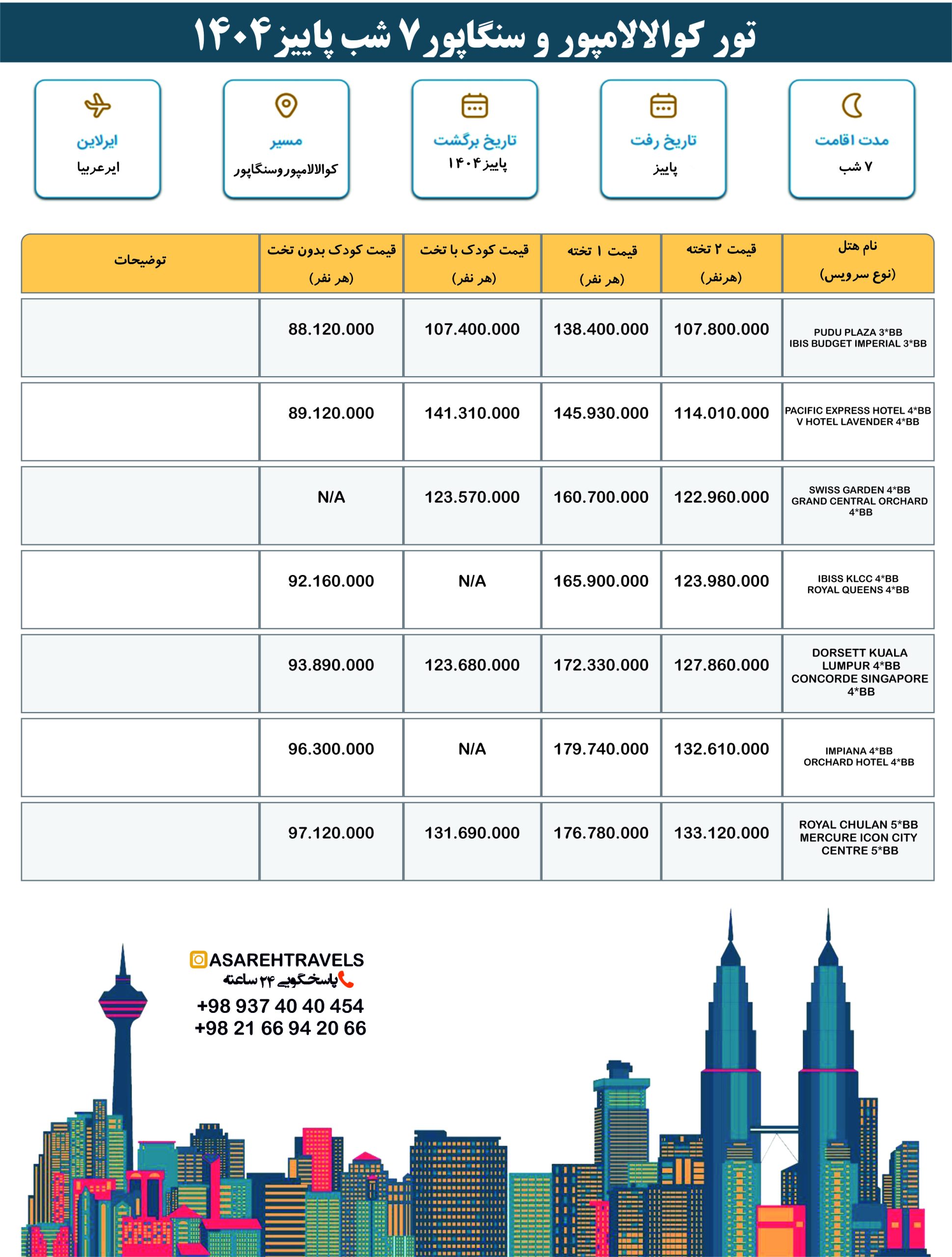 اگر به دنبال سفری بدون دغدغه هستید و می خواهید از روزهای سفر لذت ببرید، کافی است یک پکیج خوب و کاتور کوالالامپور سنگاپور – آساره تراولمل شامل پرواز رفت و برگشت، اقامت در هتل با کیفیت، ترانسفر فرودگاهی و راهنما را رزرو کنید؛ مثل پکیج تور کوالا سنگاپور آساره تراول که تمامی موارد گفته شده را شامل می شود تا شما فقط و فقط از حضور در دو کشور زیبا استفاده کنید و نگرانی خاصی بابت مسائل مربوط به سفر نداشته باشید.