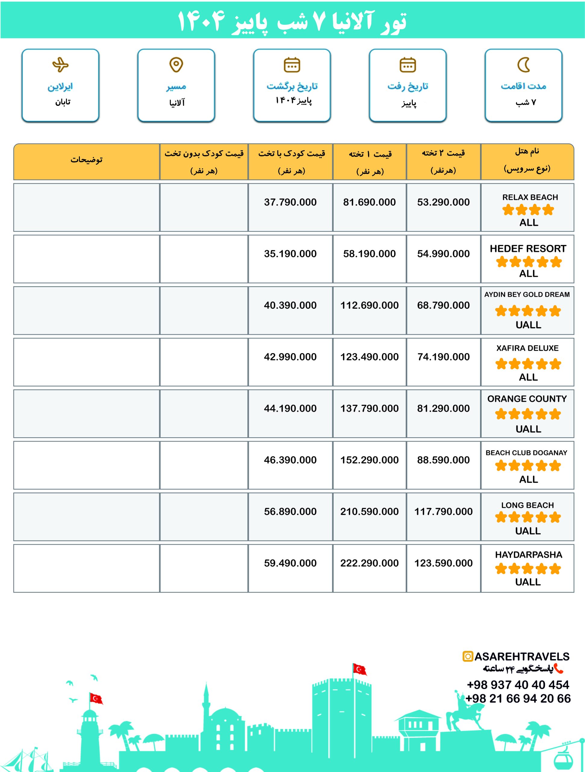 در نظر داشته باشید که برای تور آلانیا پرواز مستقیم وجود دارد و شما با انتخاب آلانیا تور آساره تراول با پرواز مستقیم به آلانیا و فرودگاه قاضی پاشا منتقل می شوید که این مسئله در جهت آسایش و کاهش خستگی سفر برای گردشگران محترم در نظر گرفته شده است.