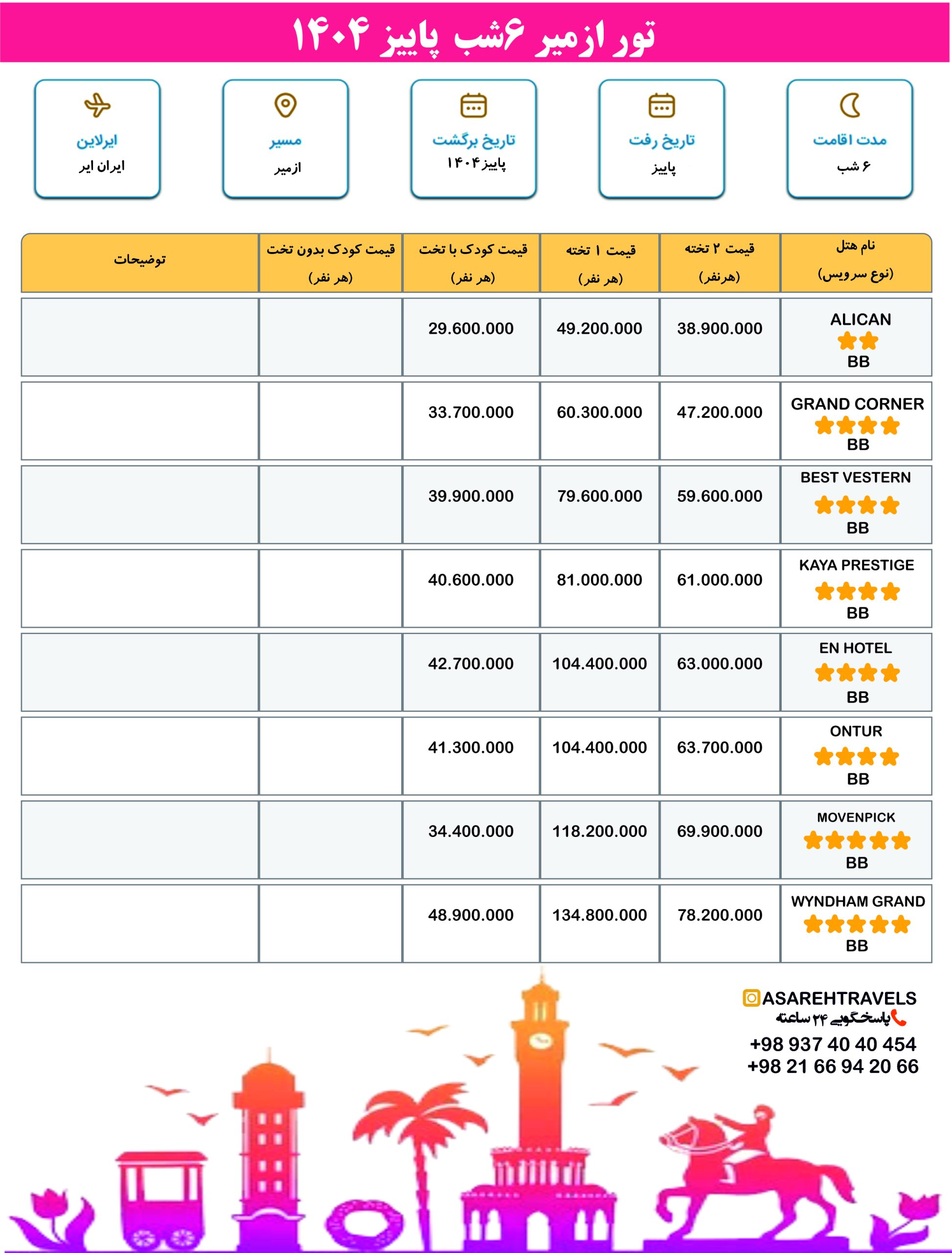 - استقبال و انتقال: پس از فرود در فرودگاه بینالمللی عدنان مندرس ازمیر با پرواز ایران ایر تور، لیدر فارسی زبان آساره تراول با تابلوی شرکت منتظر شما خواهد بود. پس از خوشامدگویی، با ترانسفر اختصاصی به سمت هتل محل اقامتتان حرکت خواهید کرد.