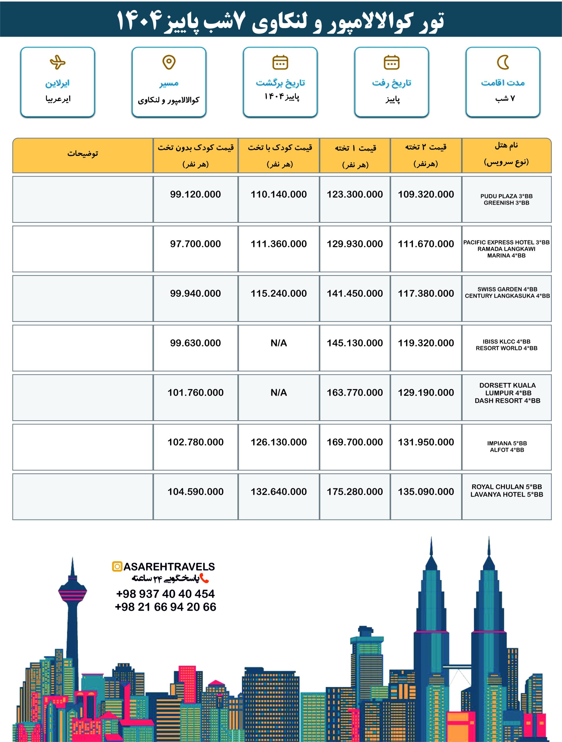 برای رزرو تور مالزی کوالالامپور لنکاوی حتما یک آژانس مسافرتی معتبر مثل آساره تراول را انتخاب کنید. ما پکیج های مختلفی را با توجه به بودجه و سلیقه شما برای تان در نظر گرفته ایم از اقامت ویژه در هتل های کوالالامپور و لنکاوی تا ترانسفر فرودگاهی. ضمنا بهتر است که پیش از رزرو تور کوالالامپور و لنکاوی حتما تجریبات مسافرانی که این سفر را تجربه کرده اند را بخوانید.